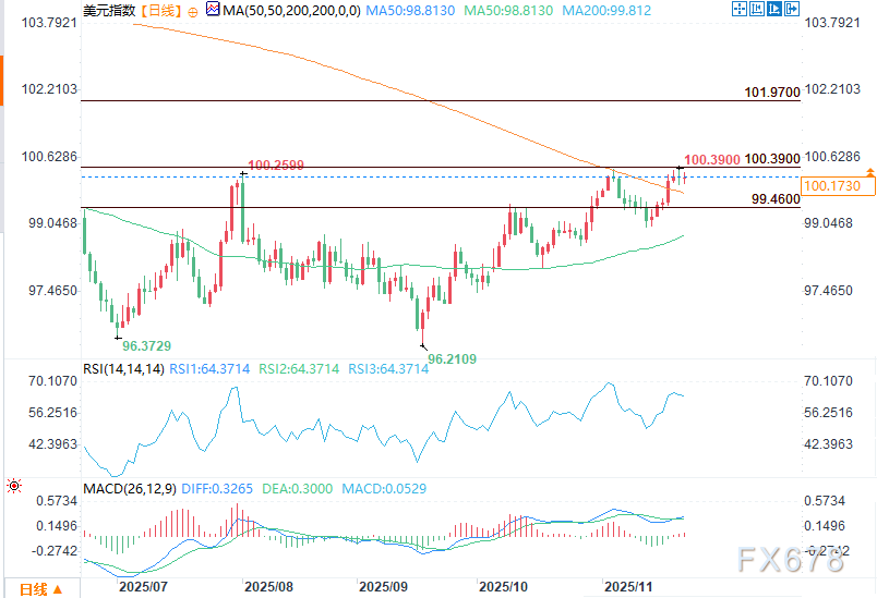 美元指数仍位于200日均线(99.812)上方的强势区域,但市场正逐步向这一关键阈值回落:若跌破99.851,可能进一步下探99.693枢轴位;上行方面,阻力位在100.395,若突破该水平,将为后续向101.977迈进开辟道路。