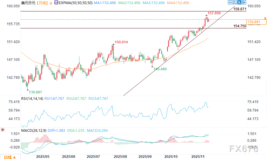 汇通财经APP讯——周一(11月24)日美盘时段,美元/日元维持短期上行趋势,价格从开盘 156.341 持续走高,日内最高点接近 157.185,当前回落至 156.785。
