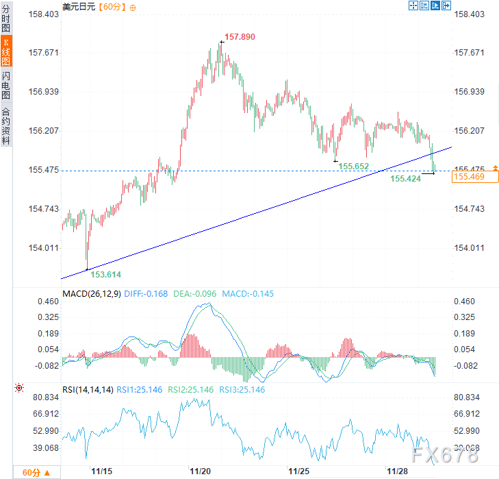 受此番鹰派言论影响,美元兑日元跌破10月以来的上升趋势线,且相对强弱指数(RSI)与MACD指标均显示看涨动能正快速衰竭,当前方向性风险显然偏向下行。