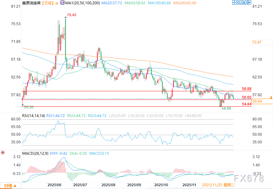 技术面来看,日线摆动图表显示原油主趋势为下行,但市场动能正逐步走高。若油价突破58.88美元,主趋势将转为上行;若跌破56.65美元,市场动能则会转向下行。