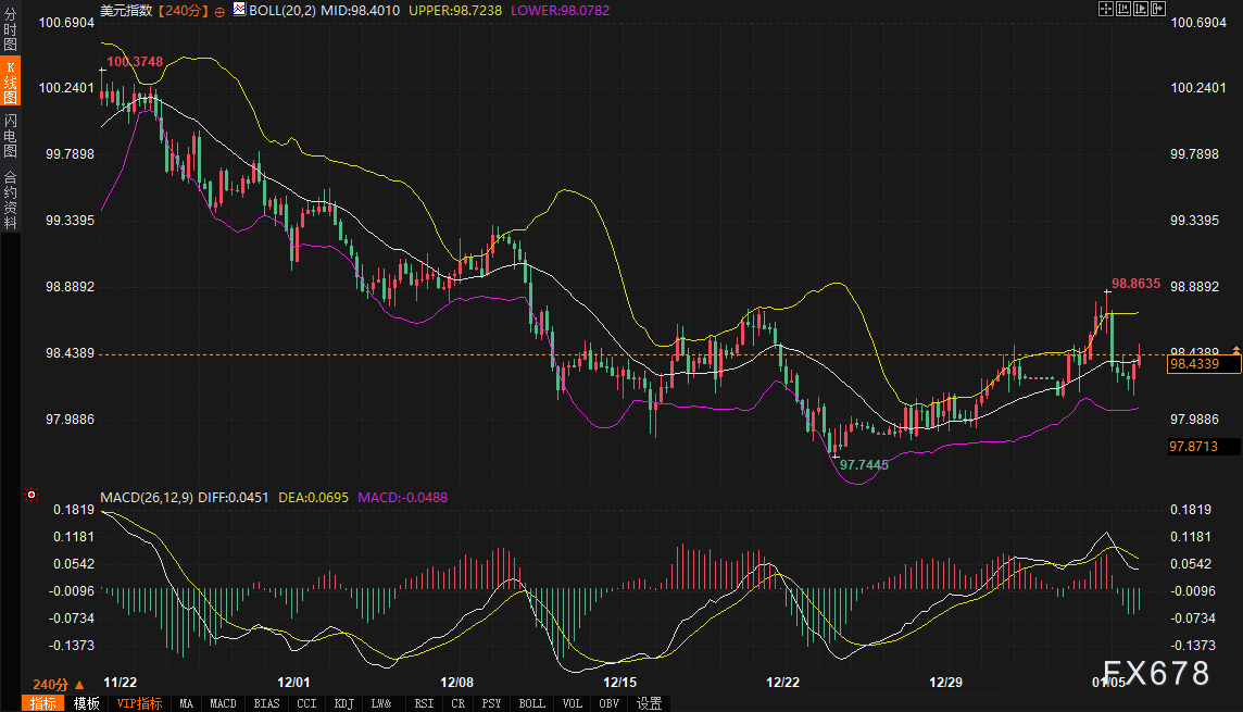 美元指数(参考合约:DXY):4小时图显示,价格正围绕布林带中轨(98.4018)震荡,上方阻力关注上轨98.7245,下方支撑首先看向下轨98.0785。MACD指标中,DIFF线与DEA线在零轴上方呈现收敛态势,但DIFF(0.0458)略低于DEA(0.0696),显示短期上行动能有所减弱,存在高位整理或回调风险。未来2-3日,98.70-98.85区域将成为关键阻力带,若无法突破,指数可能向98.10-97.90区域回撤以寻找支撑。